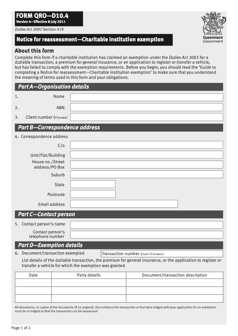 Notice for reassessment - Charitable institution exemption (Queensland Form QRO-D10.4)