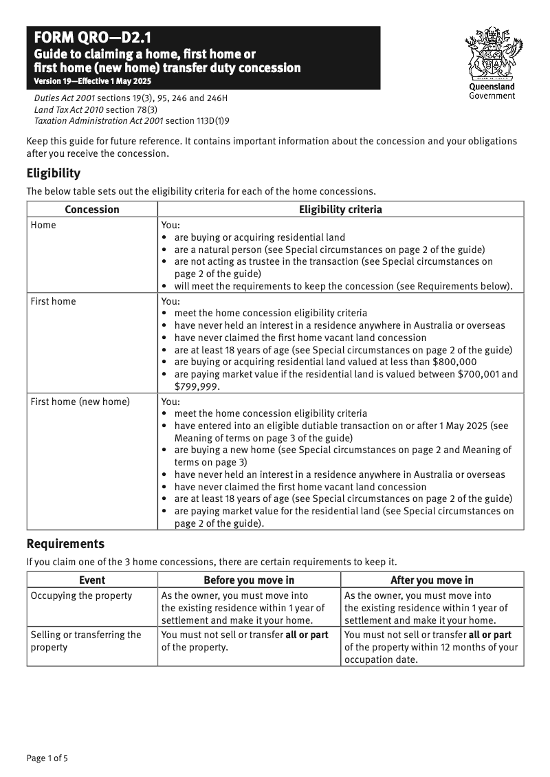 Claim a home, first home or first home (new home) transfer duty concession (Queensland Form QRO-D2.1)