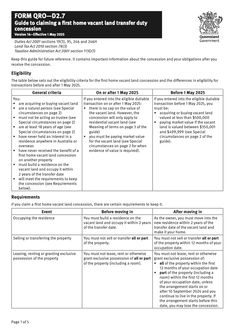 Claim a first home vacant land transfer duty concession (Queensland Form QRO-D2.7)