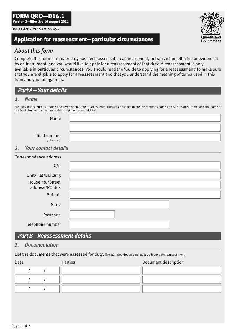 Application for reassessment - particular circumstances (Queensland Form QRO-D16.1)