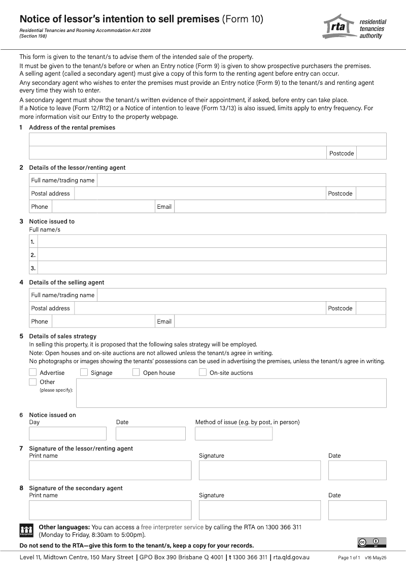 Notice of lessor's intention to sell premises (Queensland Form 10)
