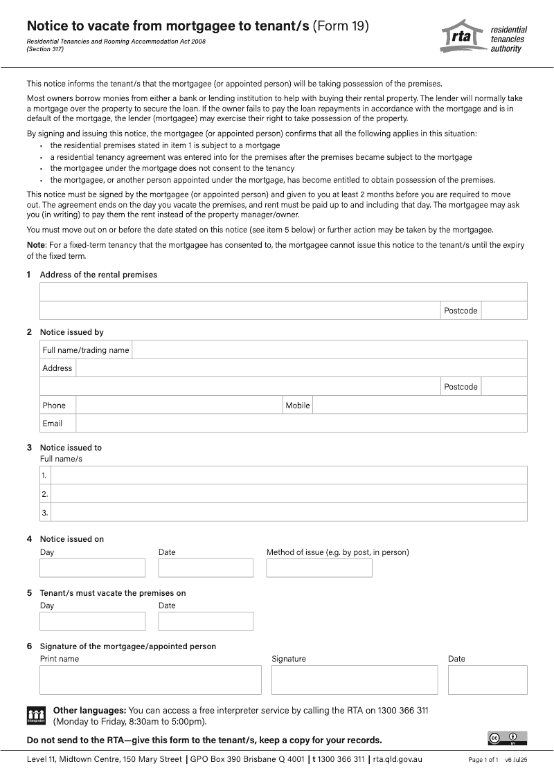 Notice to vacate from mortgagee to tenant/s (Queensland Form19)