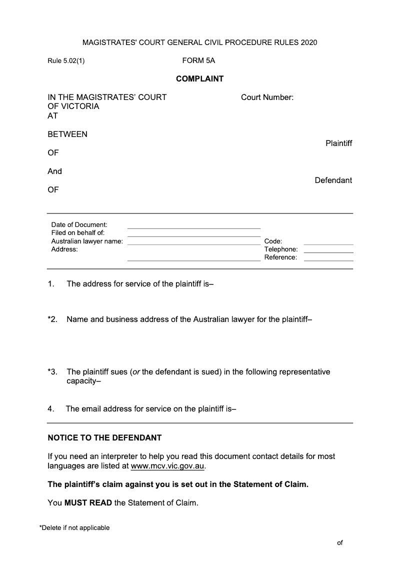 Complaint (Victoria Magistrate's Court, Rule 5.02(1))