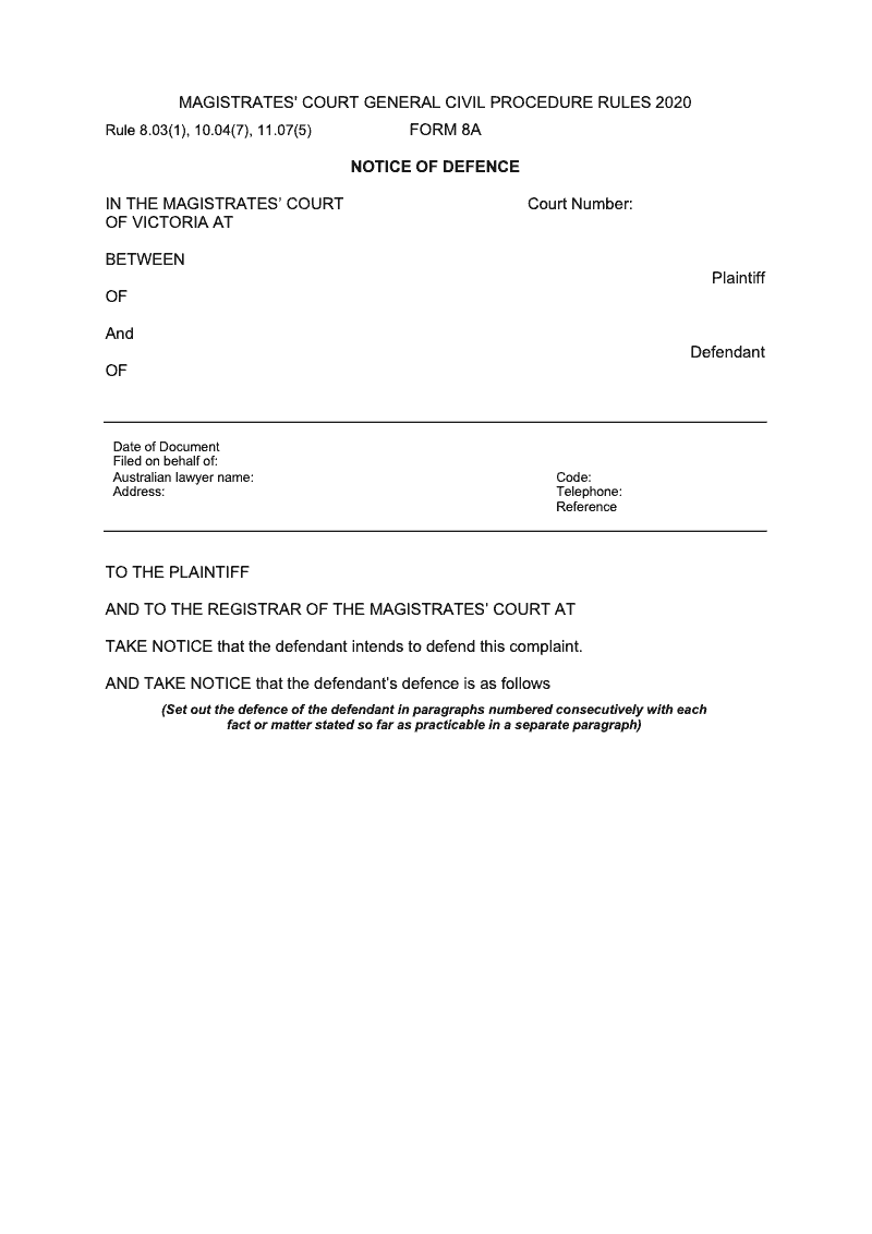 Notice of Defence (Victoria Magistrate's Court, Rule 8.03(1), 10.04(7), 11.07(5))