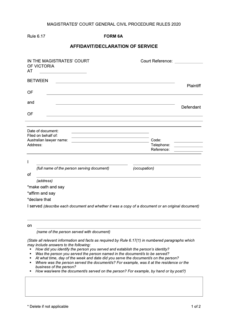 Affidavit/Declaration of Service (Victoria Magistrates' Court General Civil Procedure Rules 2020 Rule 6.17)