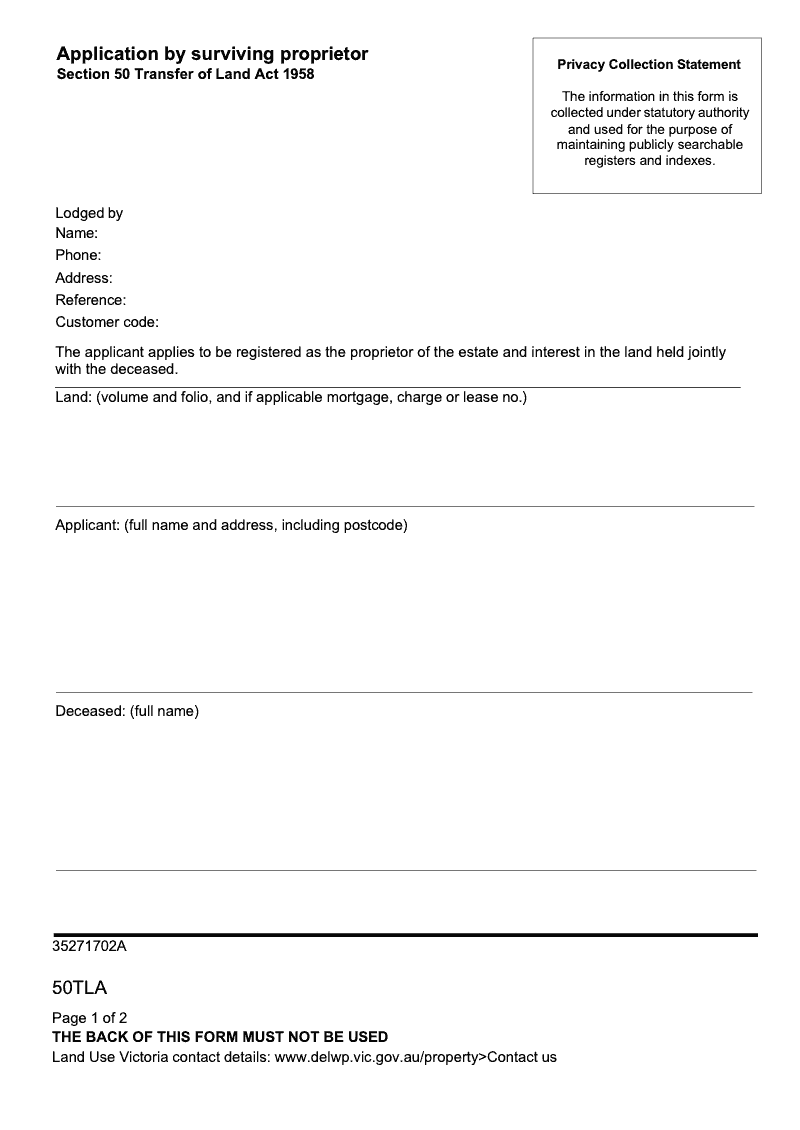 Application By Surviving Proprietor (Section 50 Transfer of Land Act 1958)