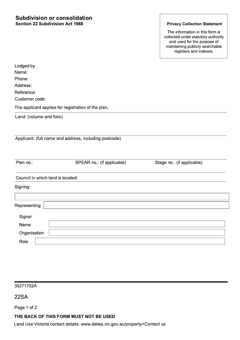 Subdivision or Consolidation (Section 22 Subdivision Act 1988)