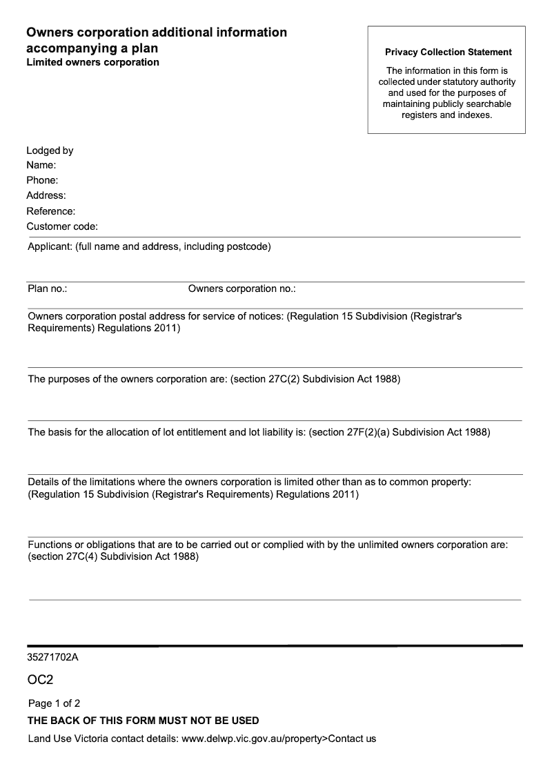 Owners Corporation Additional Information Accompanying A Plan (Limited Owners Corporation)