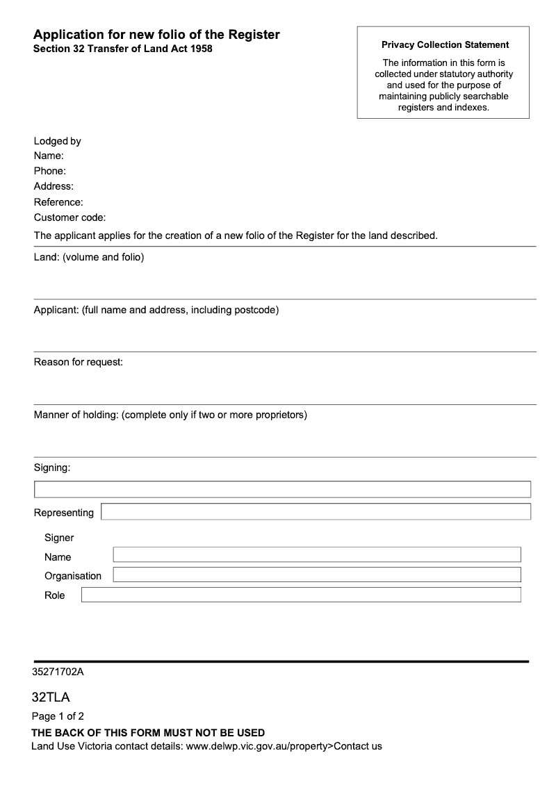 Application for new folio of the Register (Section 32 Transfer of Land Act 1958)