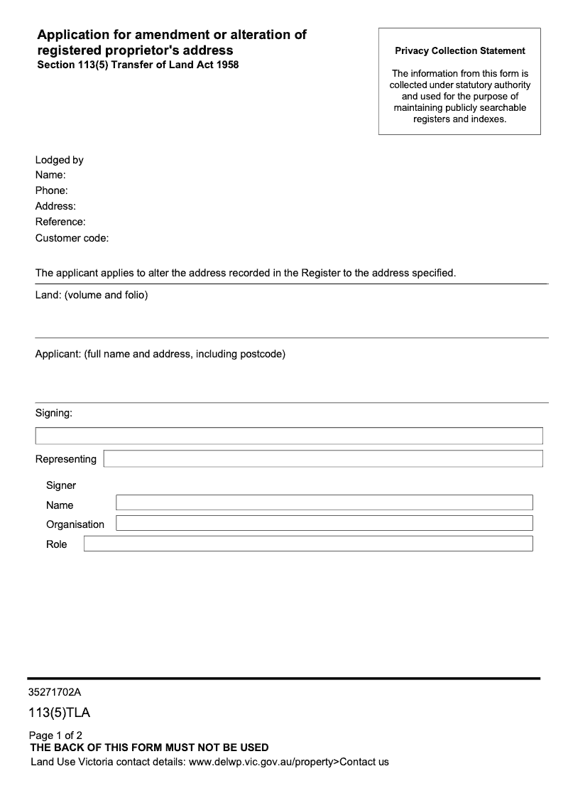 Application for amendment or alteration of registered proprietor's address (Section 113(5) Transfer of Land Act 1958)