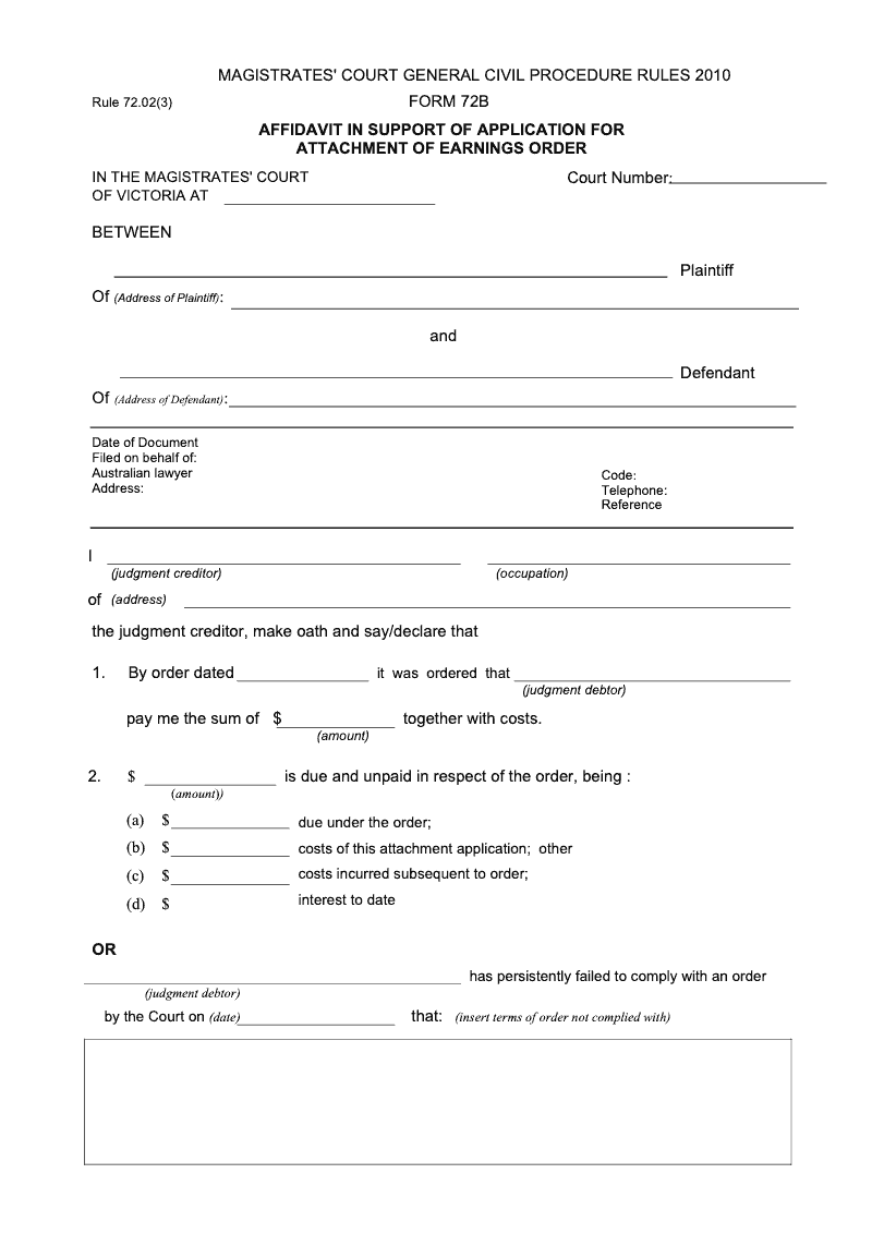 Affidavit In Support Of Application For Attachment Of Earnings Order (Magistrate's Court General Civil Procedure Rules 2010 Rule 72.02(3))