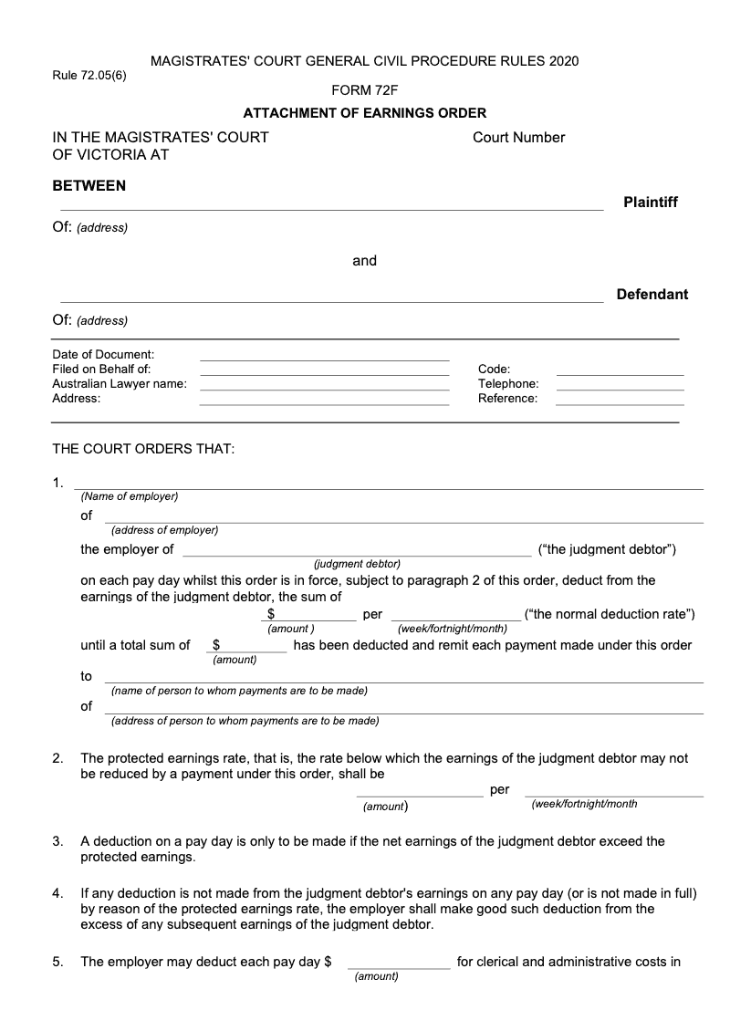 Attachment Of Earnings Order (Magistrate's Court General Civil Procedure Rules 2020 Rule 72.05(6))