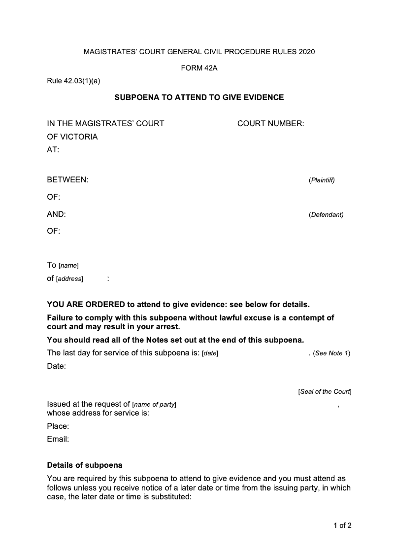 Subpoena to attend to give evidence (Magistrate's Court General Civil Procedure Rules 2020 Rule 42.03(1)(a))