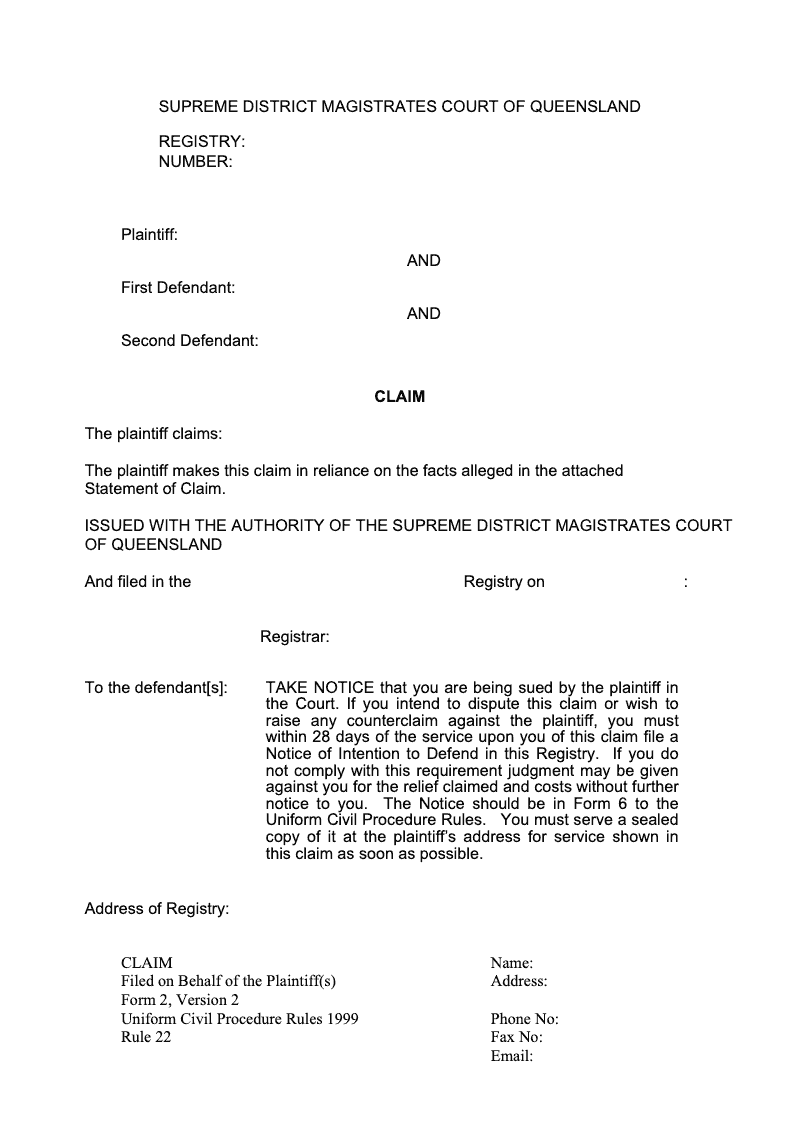 Claim (Uniform Civil Procedure Rules 1999 Rule 22)
