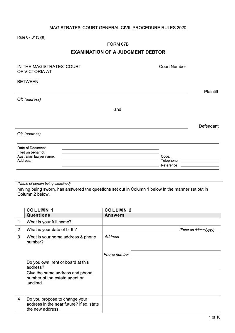 Examination of a judgment debtor (Magistrates' Court General Civil Procedure Rules 2020 Rule 67.01(3)(8))