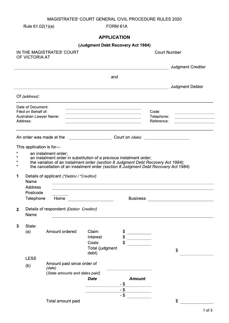 Application for instalment order (Magistrates' Court General Civil Procedure Rules 2020 Rule 61.02(1)(a))