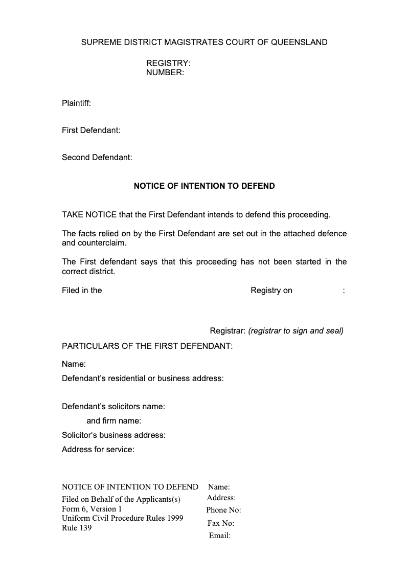 Notice Of Intention To Defend (Uniform Civil Procedure Rules 1999 Rule 139)