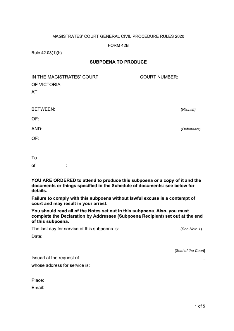 Subpoena to produce (Magistrates' Court General Civil Procedure Rules 2020 Rule 42.03(1)(b))