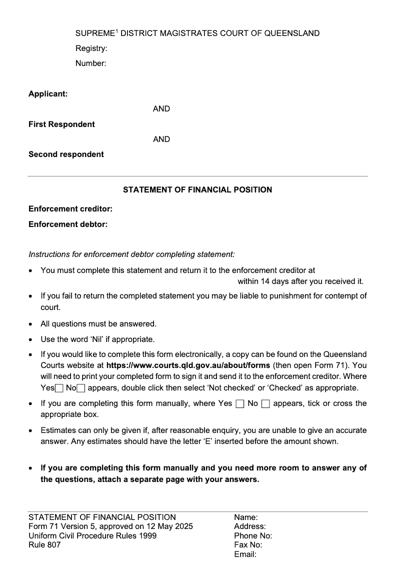 Statement Of Financial Position - Individual (Uniform Civil Procedure Rules 1999 Rule 807)