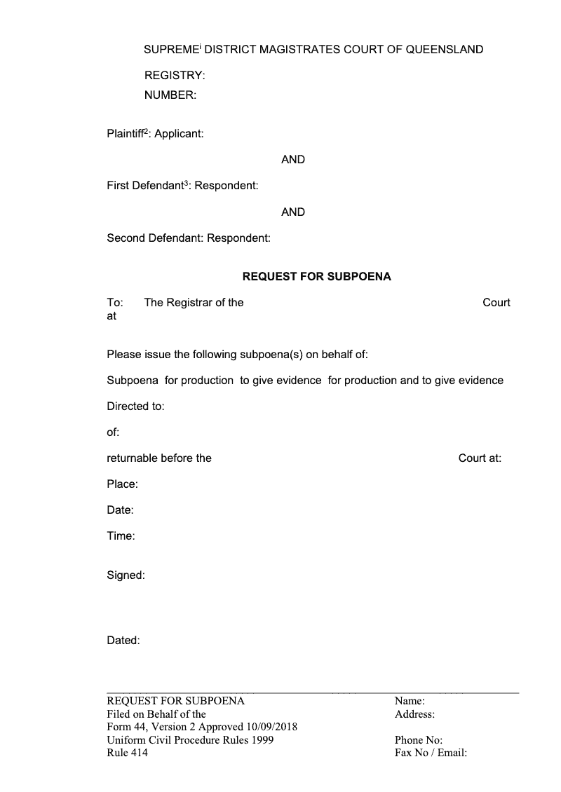 Request For Subpoena (Uniform Civil Procedure Rules 1999 Rule 414)