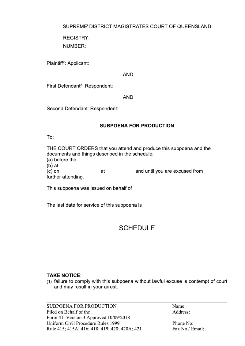 Subpoena For Production (Uniform Civil Procedure Rules 1999 Rule 415; 415A; 416; 418; 419; 420; 420A; 421)