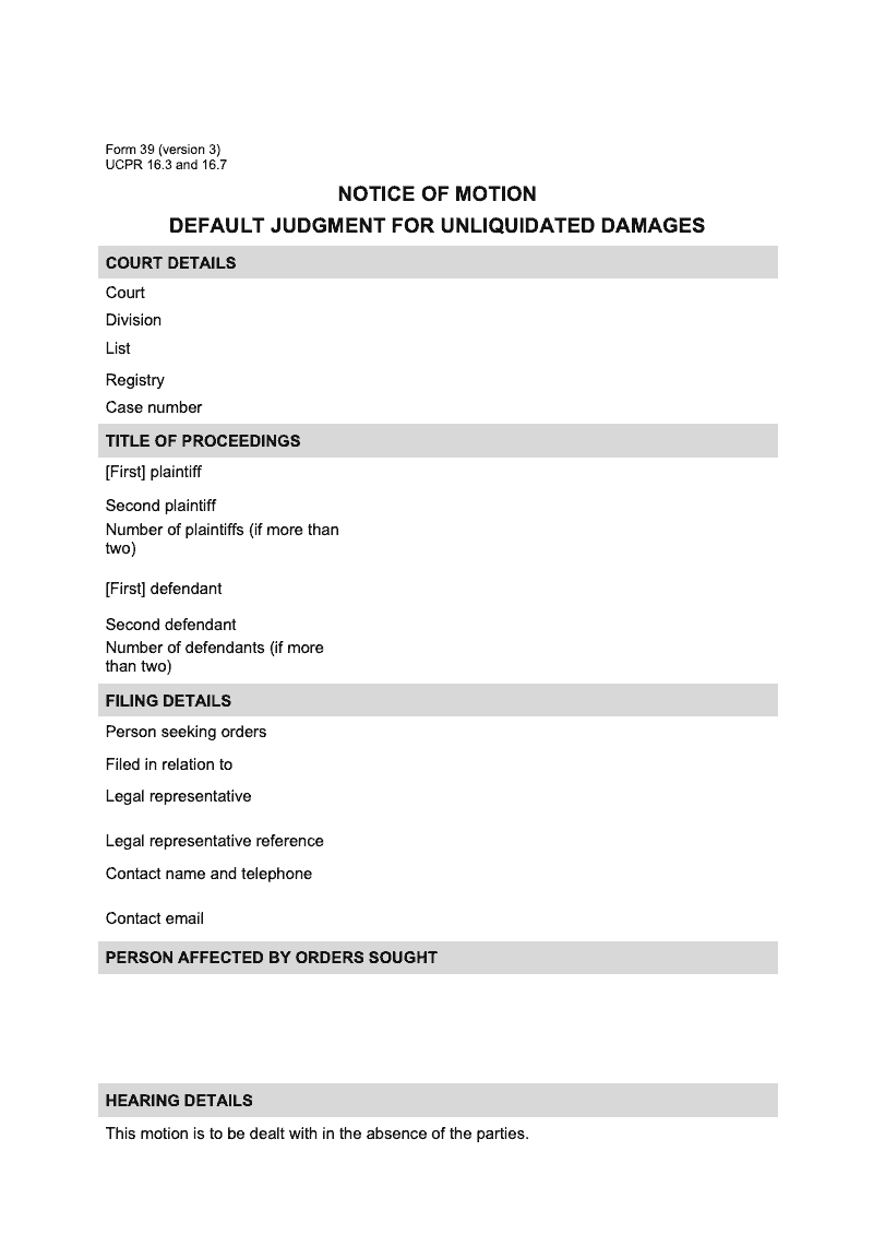 Notice of motion - default judgment for unliquidated damages (UCPR 16.3 and 16.7)