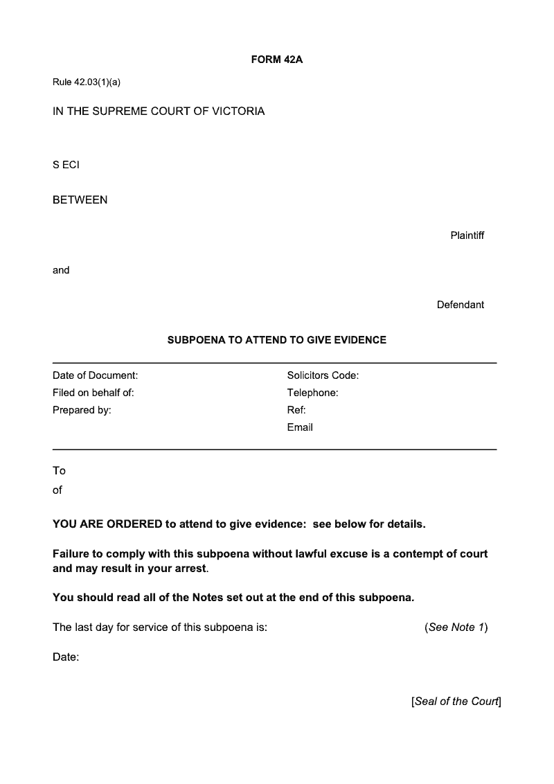 Subpoena to attend to give evidence (Rule 42.03(1)(a))