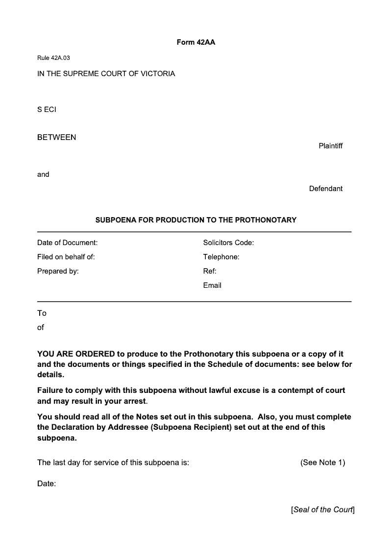 Subpoena for Production to the Prothonotary (Rule 42A.03)