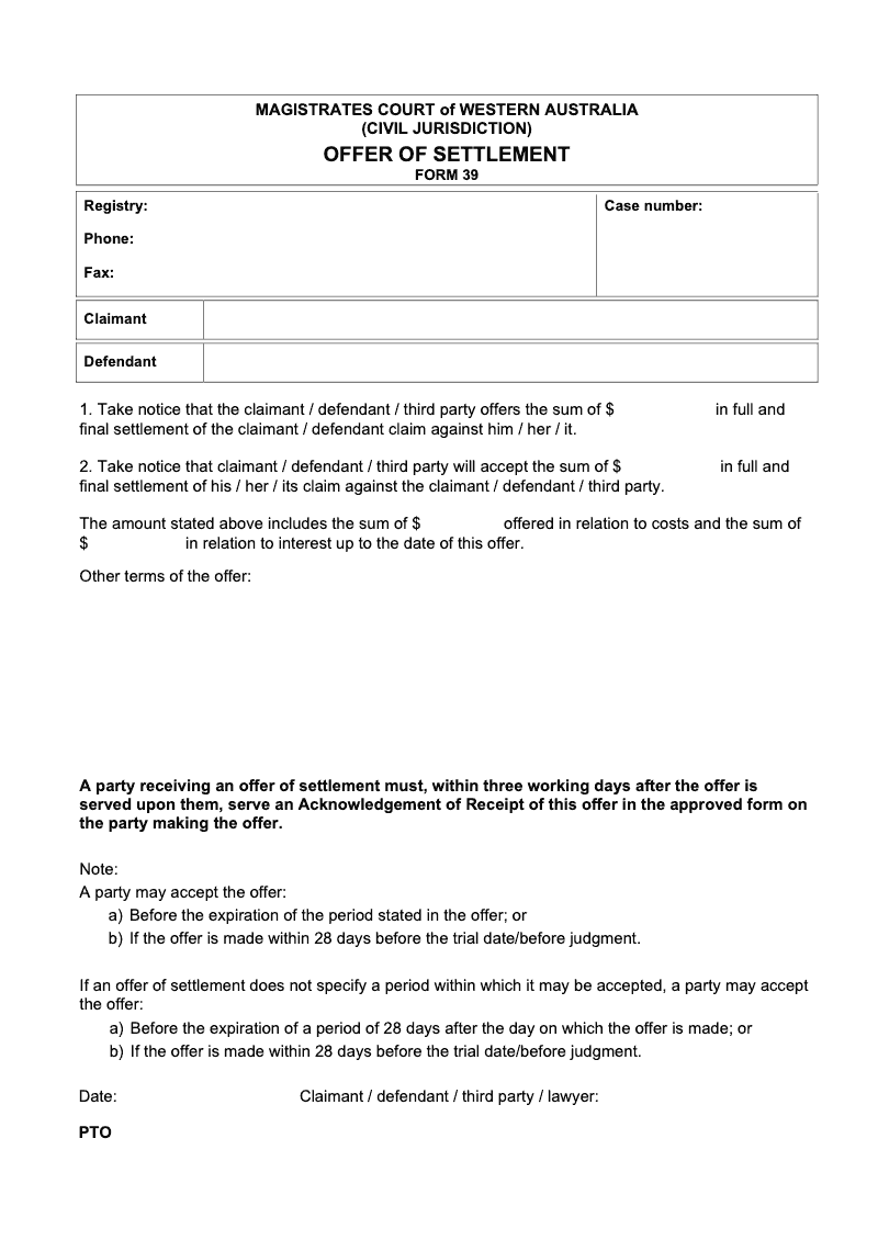 Offer of settlement (Magistrates Court of Western Australia)