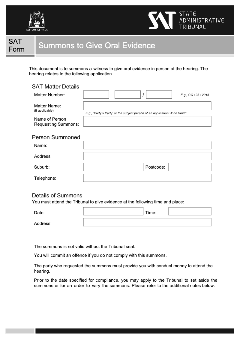 Summons To Give Oral Evidence (State Administrative Tribunal)